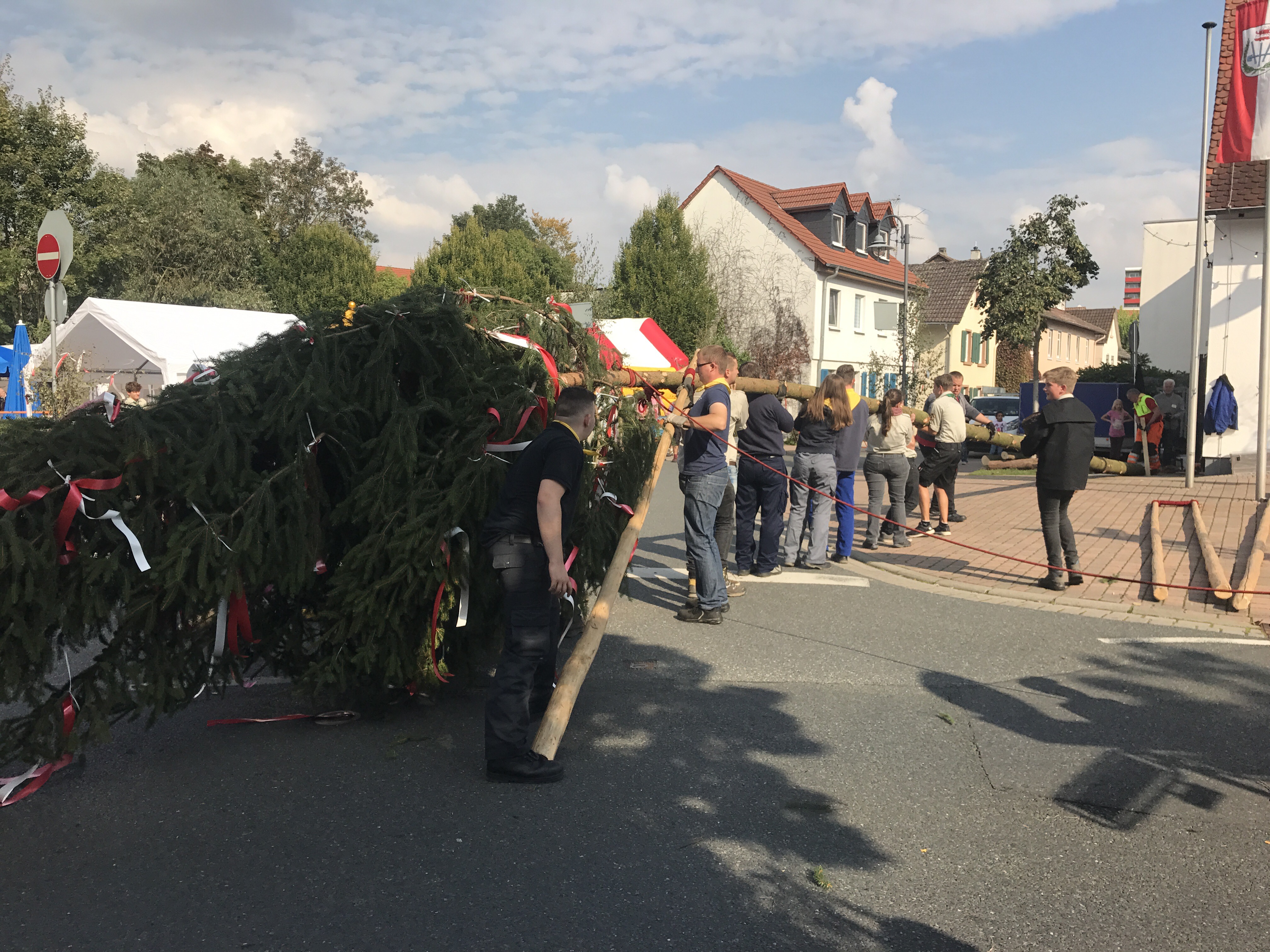 Heute hatten wir ziemlich viel Programm. Morgens sind 3 von uns mit in den Wald gefahren um den Kerbebaum abzuholen. Zusammen mit Feuerwehr, Pfadfindern und unserem Traktor.