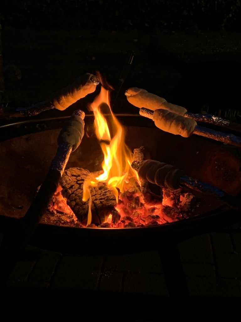 Wir haben neulich wieder Stockbrot mit den Kids gemacht, diesmal mit Schinkenwürfeln drin, das war super lecker.